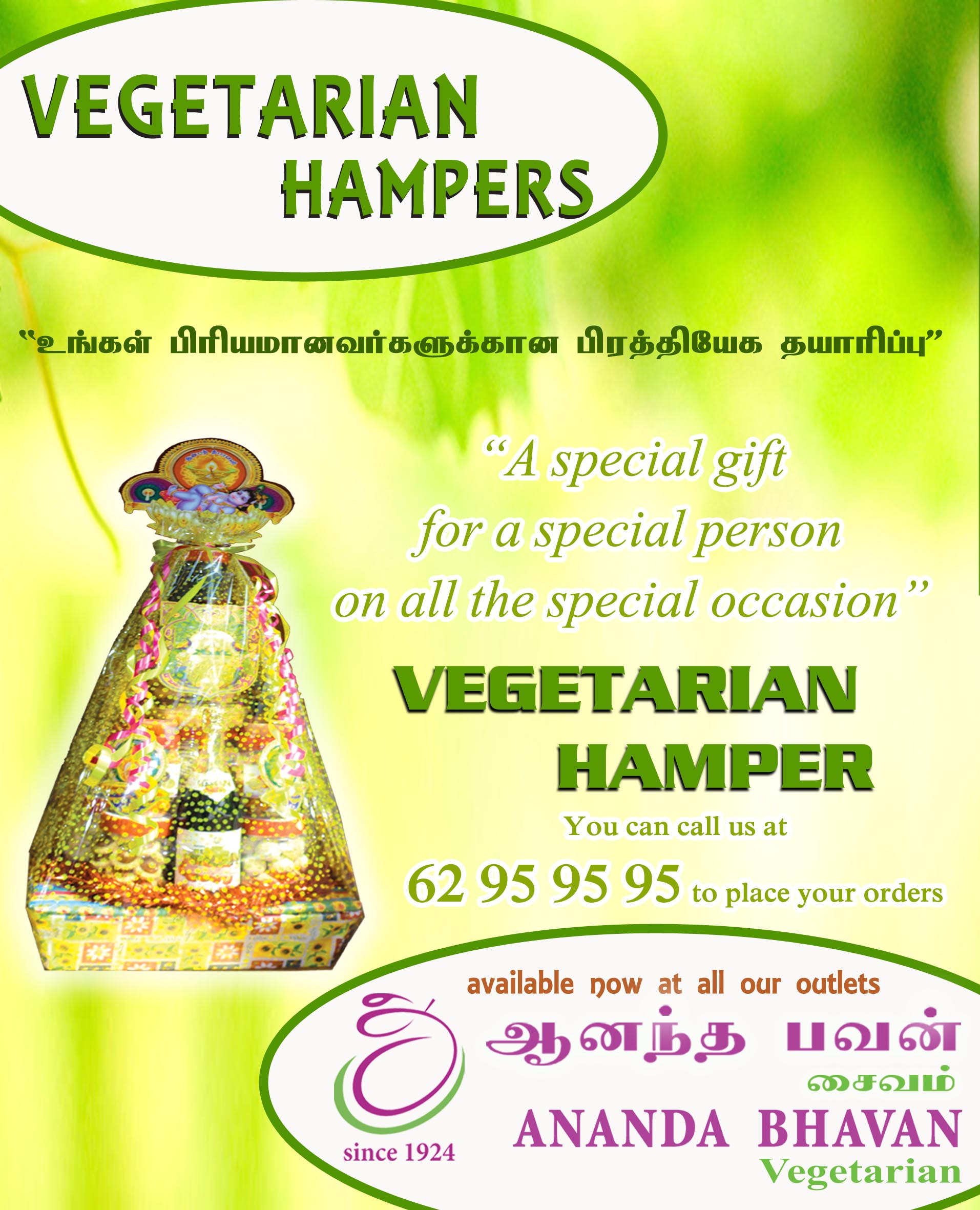 Our vegetarian hampers are a huge demand during the festive season. Now we plan to make it available all year around. Specially packed upon your order, our hampers are a good choice when you run out of ideas to express your appeciation or give someone a special gift for any occassion.